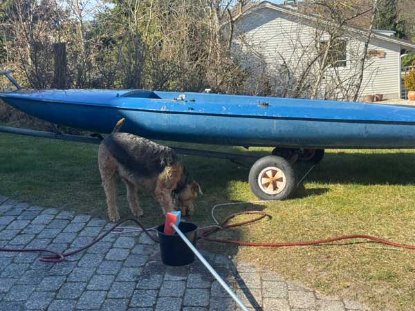 Første step var at indlede højst tiltrængt vask af den, og det lykkedes da også at få noget sæbe tværet rundt, mens min skibsinspektør bed i vandslangen og væltede sæbevand.